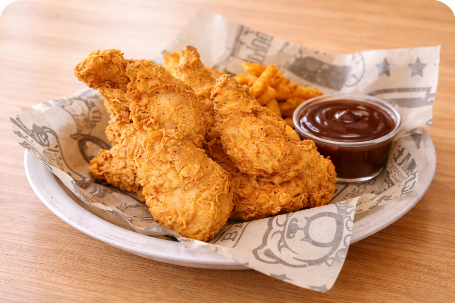 We bread and fry every tender fresh. Dip them in one of our signature sauces—we recommend the Moonshine Sauce..